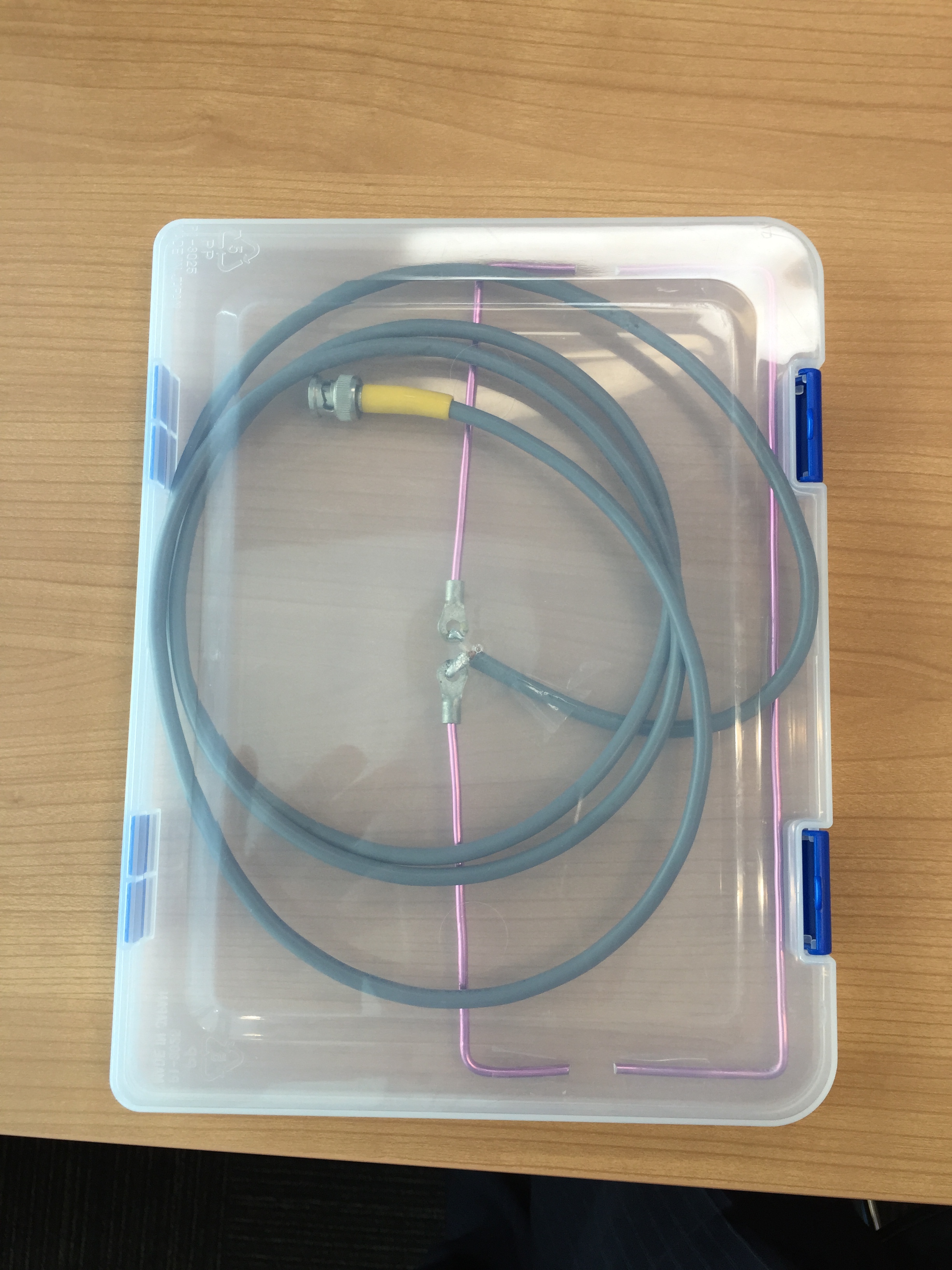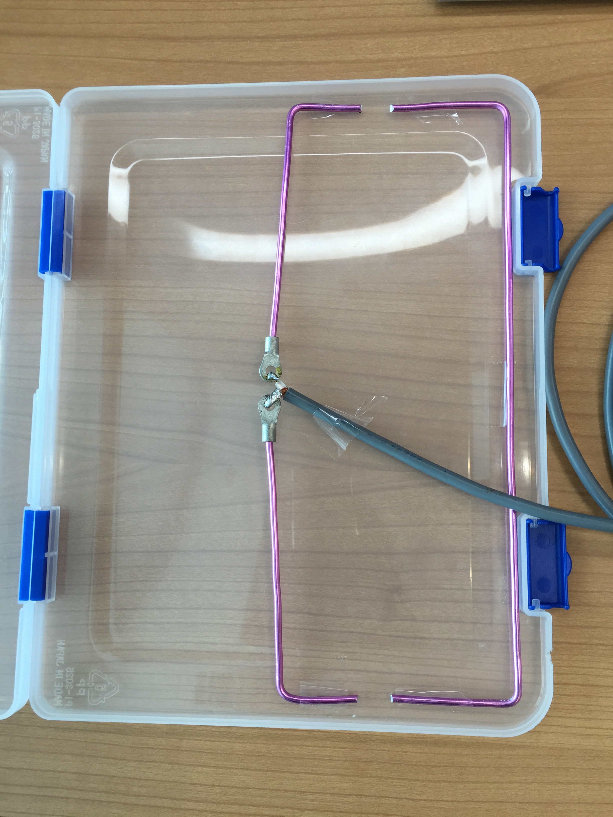 100円ショップで買ったB5版の書類ケースに入ります。エレメントも、100円ショップで買った針金です。アルミにハンダは付かないので、圧着端子を取付けてからハンダ付けしました。エレメントはセロハンテープで仮付けという極めていい加減なものです。
