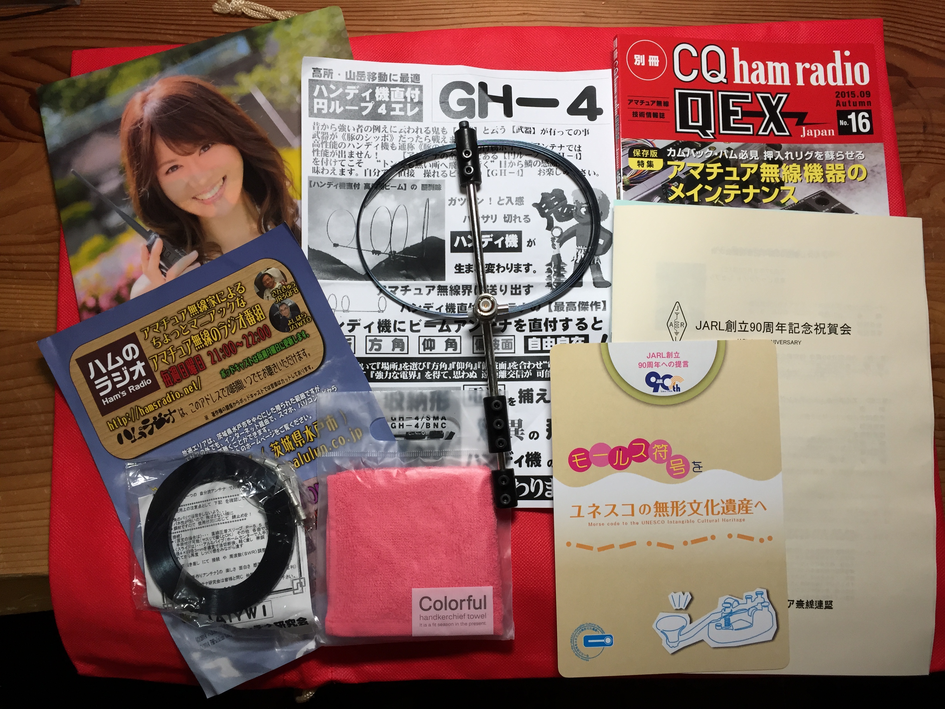 場内は、おもに武蔵野クラブのみなさんと回りました。グローバルアンテナ研究会(http://ja1ywi.web.fc2.com/index.html )のハンディ機用ループアンテナは前からほしかったのです(Photo: JG1EJY TNX! にやけてますね。お恥ずかしい(笑))。