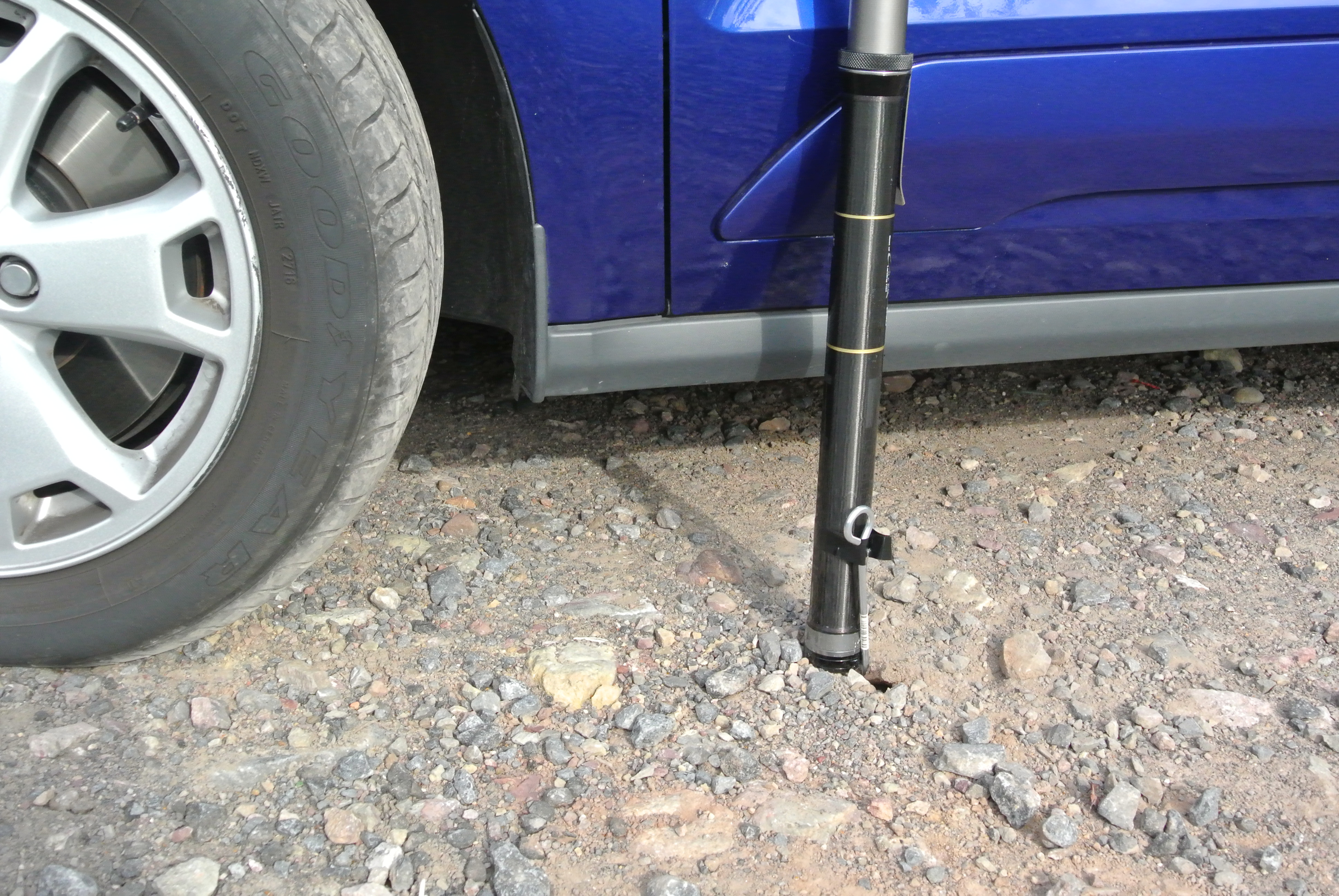 今回の旅行の直前に、釣り竿ではなく、先端まである程度の太さがある玉網の柄を調達しました。Tailwalk社製 CATCHBAR KAI micro6.3mのものです。短縮すると50cmとなり、トランクにも楽々入る優れものです。伸ばして振ってみても、釣り竿のように大きくしなることがなく、とてもいい感じです。ただし、材料がグラスファイバーではなく、釣り竿アンテナ等には不向きとされるカーボン製なので、アンテナに悪影響がでないかが気がかりでした。