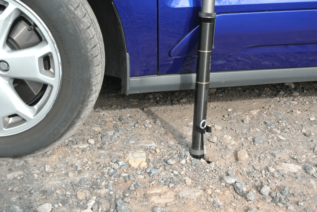地面にペグを刺し、手網用の伸縮柄を垂直に立てます。