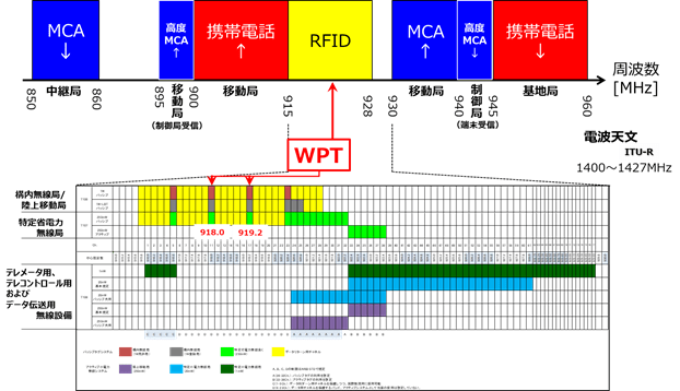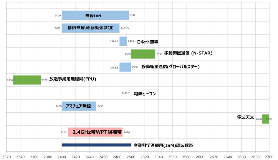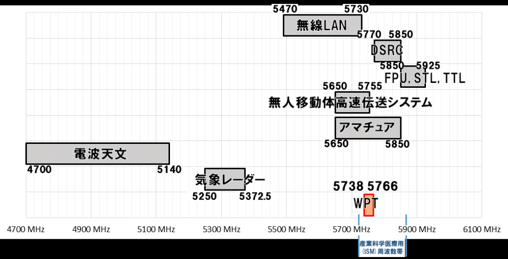 920MHz帯、2.4GHz帯、5.7GHz帯を使って、電力をワイヤレスで送信するという規格(WPT)です。WPTに使われる周波数帯と既存のシステムの関係について、報告書案の中に図が示されています。