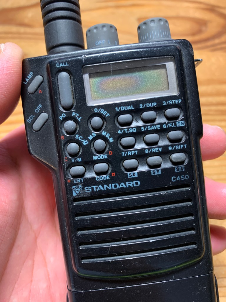 開局当時のリグはSTANDARDのC450ただ1台。栄えある第1送信機です。バイト代を溜めて秋葉原で買いました。いろいろなところに連れ回したので傷だらけですが、今でも動態保存されています。