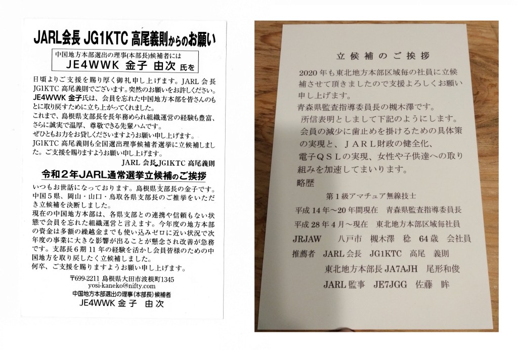 2022年の選挙では、候補者が自分の見解をもっと多く記載でき、有権者の方と意見交換ができるようなプラットフォームをJARLが用意し、選挙活動はオンラインに移行させ、多くの問題が長年指摘されてきた選挙ハガキは一律禁止とすべきと考えます。