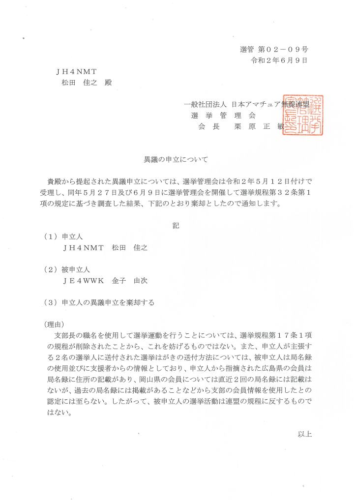 中国理事当選者・JE4WWK金子由次氏に対する2件の異議(JA4DLF綱島俊昭氏(現中国理事)申立分と、JH4NMT松田佳之氏(現中国社員)申立分)について、選挙管理会は2件とも、令和2年6月9日付けで「棄却」としました。いずれも、驚くべき内容でした。