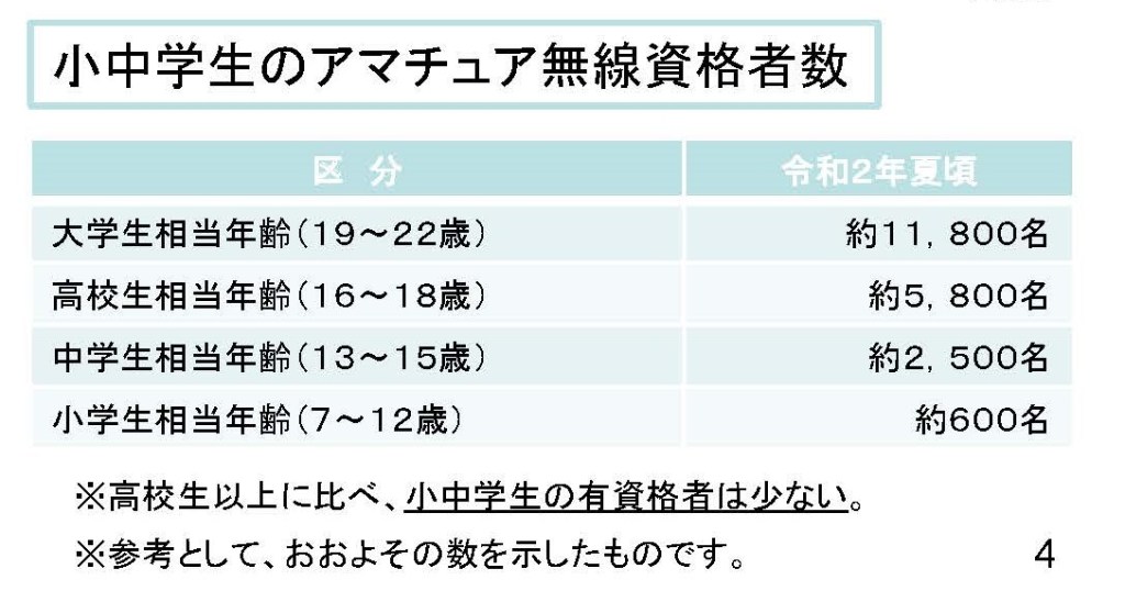 小中学生のハムは、全国で3000人強しかいないというのです。このままでは、この子たちが大人になったときには、そもそも「アマチュア無線」いや「無線通信」なるものを知る人がほとんどいない状況になってしまうのではないでしょうか。