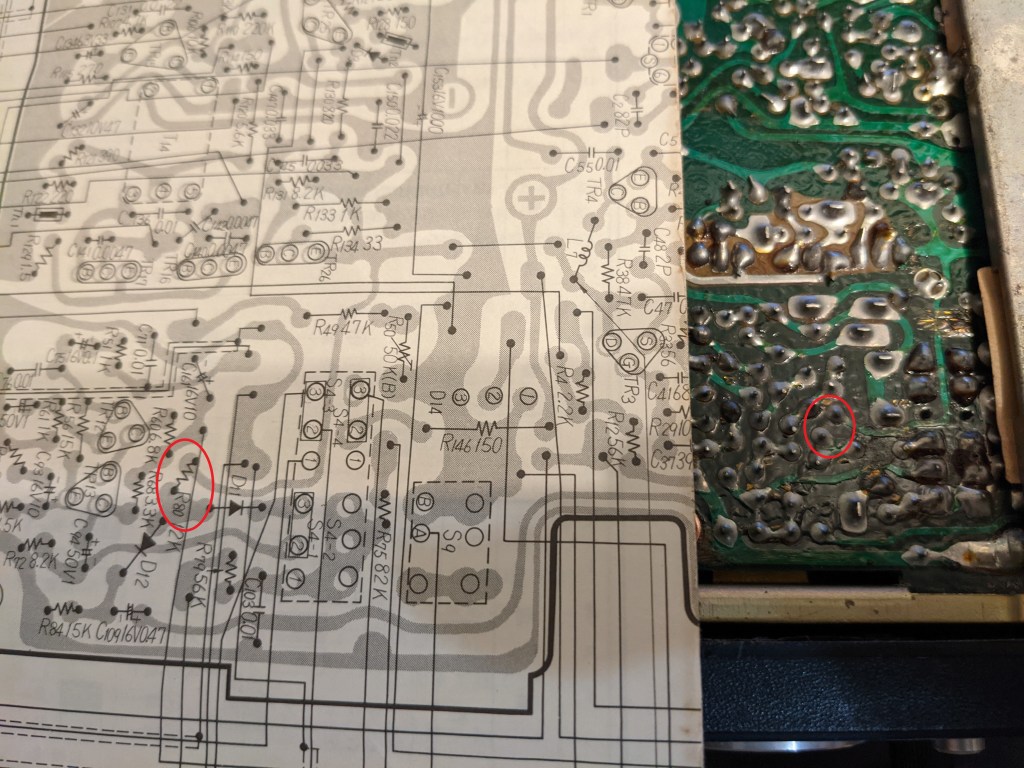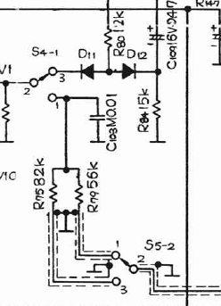 「コレクタ変調回路上の線路の異常」のチェックはなんとなく大変そうなので、まずは後者を攻めてみます。AM/FM切り替えスイッチ(S4-1)から出ている線にテスタを当てていきますが断線はなさそうです。回路図を見てみると、AM/FM切り替えスイッチ(S4-1)からRF出力切り替えスイッチ(S5-2)につながる回路があります。