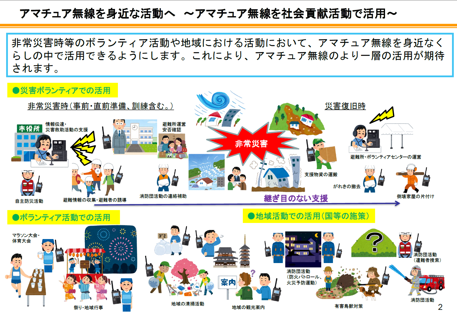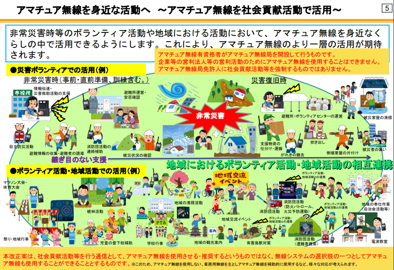 特にパブリックコメントで問題になっておりましたのは、5ページの、「アマチュア無線を身近な活動へ」と題する図面の中で、当初地域活動での活用例といたしまして、消防団活動や有害鳥獣対策が大きく描かれておりましたため、あたかもそれらの活動にアマチュア無線を推奨しているように受け止められかねなかった点だったかと思いますが、その誤解を解くため、今回、図面をかなり修正していただきまして、あくまでも地域におけるボランティア活動等地域活動の相互連携の一例として示されているだけであって、決して推奨するものではない、あくまでも選択肢の1つとして利用できることを示しているにすぎないという意図をよりクリアにしていただけたかと感じております。