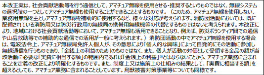 アマチュア無線の社会貢献活動についての補足ということで、我々総務省のほうでも、今回の制度改正をもしお認めいただきましたら、今後、どのような形でこれを使っていただけるのかといった形で、電波利用のホームページ等々に公開していきたいと思っておりますし、今回のパブコメの考え方も総務省のホームページで公開をしてまいります。「また」で書いておりますけれども、2つ目の矢印ですけれども、JARLさんからも、身近な生活の中で広まるように、連盟としてもガイドラインの作成等に努めてまいりますという御意見をいただいておりますので、引き続き連携を進めていきたいと思っております。