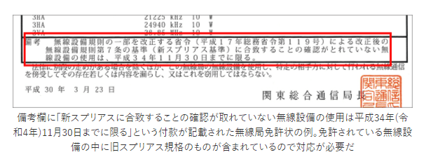 | ③新スプ規格を満たさない無線機 | 新規開局・増設はもうダメ すでに免許を受けている無線機は2022年11月30日まで |