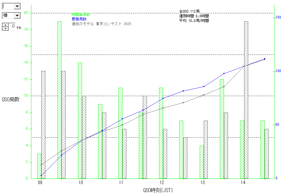 初めての試みとして、Ctestwinでレートグラフも作ってみました。今年の9時台後半に局数が伸びているのは、単に9時の開始時刻に出遅れただけと思われます。昨年は14時台のラストスパートで局数が伸びていますが、今年はそれがありません。今年はコンテストに出ずに外出された方が多かったのかもしれません。