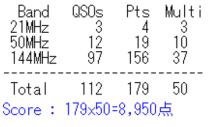 昨年と比べて144MHz帯の局数が10局以上減り、21MHzと50MHzを合わせて、去年のQSO数をようやく1コ上回りました。