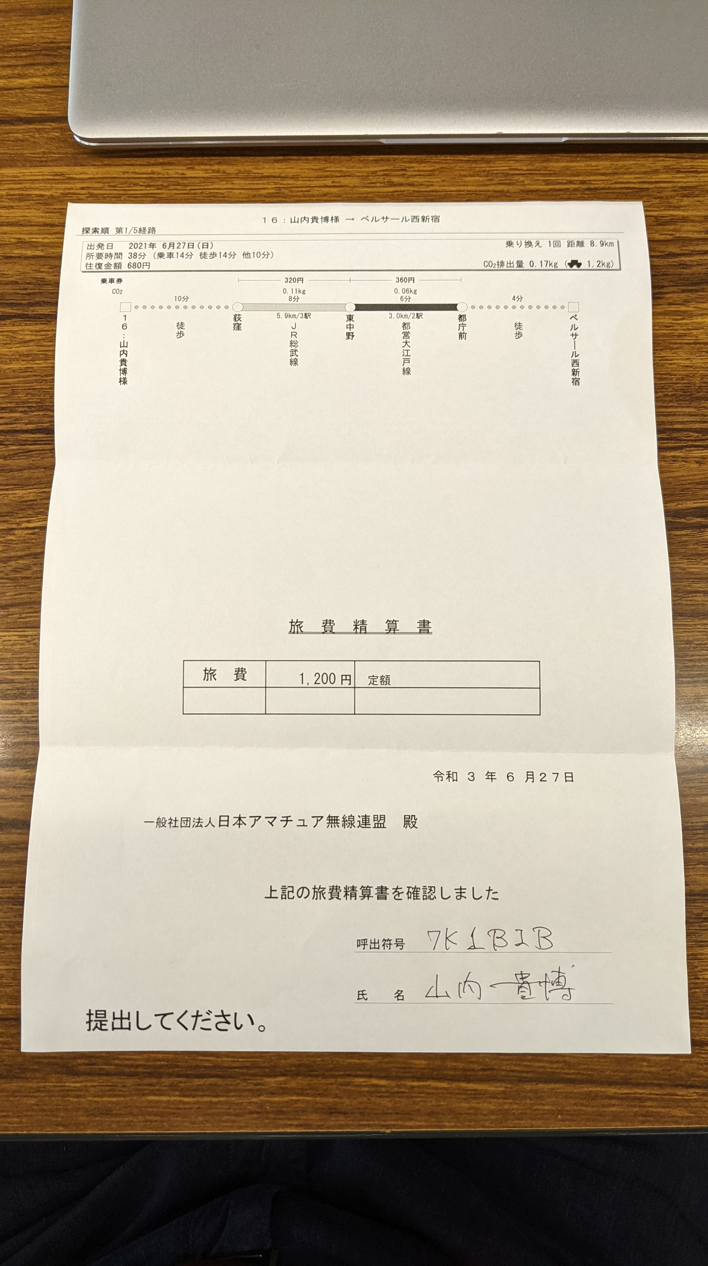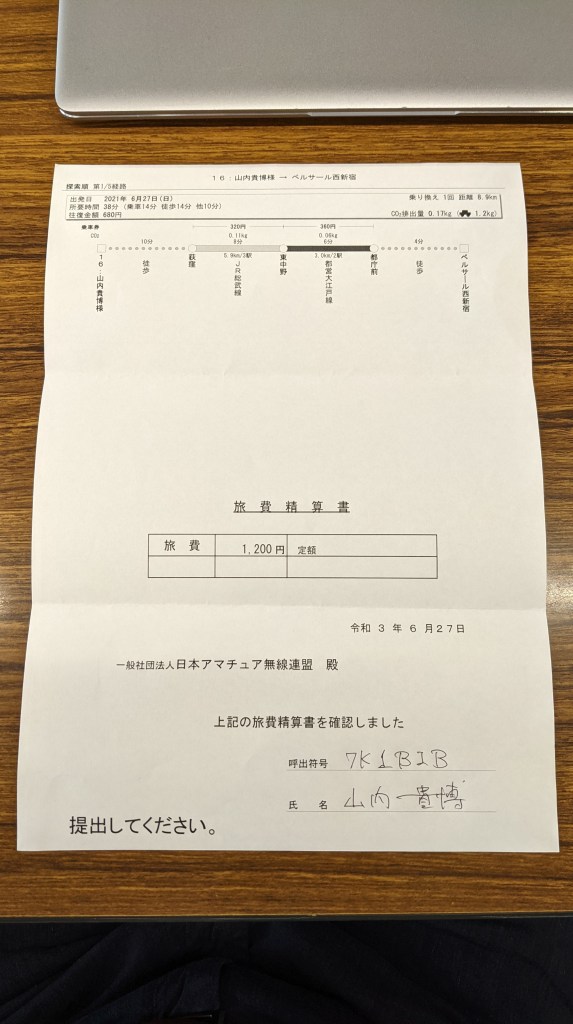 最寄り駅から会場までの往復運賃は、精算書の上部にあるように680円なのですが、事務局に確認したところ、JARL役員旅費規定第6条第3号「30km以内の交通費は、片道600円とする」により、600円x2=1200円と計算したとのことです(同規定は、社員にも準用されるとのことです。附則第2項。)。上乗せの差額520円をいただく理由は無いと思いますので、少額とないがしろにせず、JARLが正常化された暁に何らかの形でJARLにお戻ししようと思います。