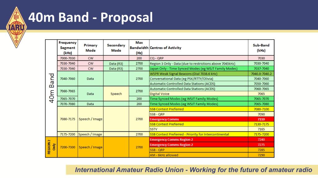 早まるのは禁物ですが、もし、国内FT8の周波数を7100-7200kHzに持っていけるとした場合、さらにIARUの新バンドプラン案の以下の点を考慮する必要がありそうです。