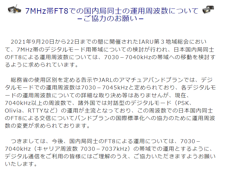 そして2021年12月13日、「7MHz帯FT8での国内局同士の運用周波数について -ご協力のお願い-」という文章が、JARL Webの奥の方にこっそり掲載されていることが「発見」されました。
