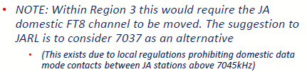 IARUの新バンドプラン案には、随所に「JAでは、7045kHz以上ではJA局同士のDataモードのQSOが禁止されている」と書かれています。