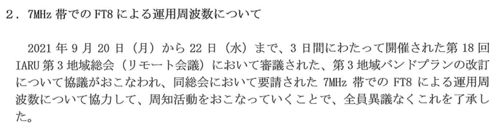 2021年9月20日(月)から22日(水)まで、3日間にわたって開催された第18回IARU第3地域総会(リモート会議)において審議された、第3地域バンドプランの改定について協議がおこなわれ、同総会において要請された7MHz帯でのFT8による運用周波数について協力して、周知活動をおこなっていくことで、全員異議なくこれを了承した。