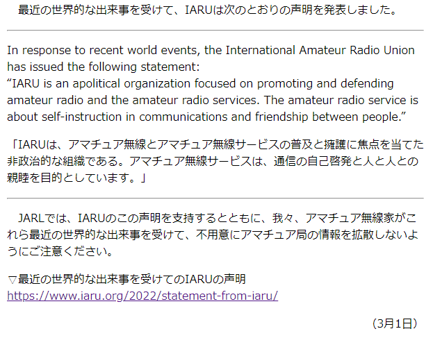 さらに、「不用意にアマチュア局の情報を拡散しないようにご注意ください。」の部分は、このIARUの声明ではなく、IARU第1地域の声明(https://www.iaru-r1.org/2022/note/