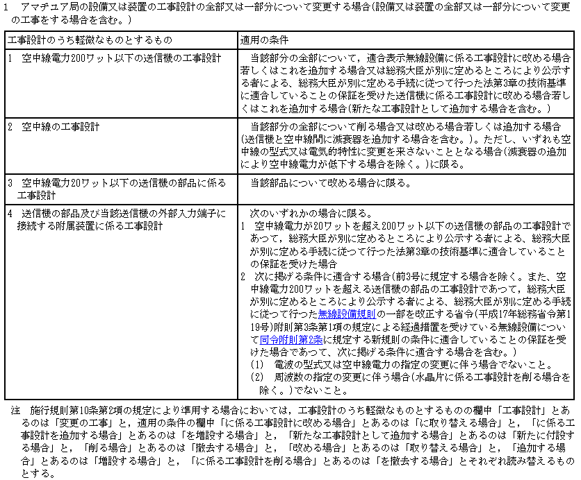 | 1 空中線電力200ワット以下の送信機の変更の工事 | 当該部分の全部について, 適合表示無線設備に取り替える場合若しくはこれを増設する場合 又は 総務大臣が別に定めるところにより公示する者による、総務大臣が別に定める手続に従つて行つた法第3章の技術基準に適合していることの保証を受けた送信機に取り替える場合若しくはこれを増設する場合(新たに付設する場合を含む。) |
