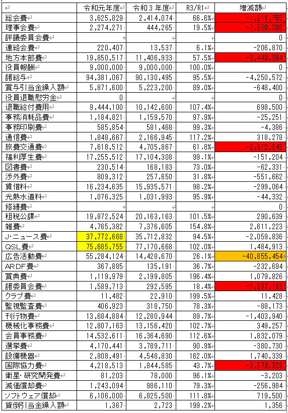 (1) 赤字財政を抜本的に解決するためには、大口の支出である紙JARLニュースとビューロー費(黄色で塗った項目)に手を付ける必要があることは明らかである。環境保護の観点からも、紙の削減に取り組み、浮いた経費を若者に対するアマチュア無線振興策に振り替えるといった施策を採るべきと考えるが、髙尾会長及び日野岳専務理事のご見解を伺いたい。