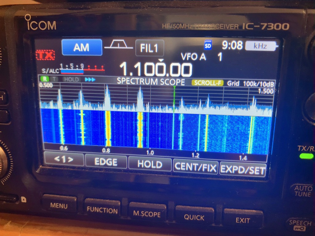 1100kHzを中心に、約550kHz~1450kHzの範囲を表示させている。0.6付近(NHK第1)、0.7付近(NHK第2)、0.8付近(AFN)、0.95付近(TBS)、1.1付近(文化放送)、1.25付近(ニッポン放送)、1.45付近(RFラジオ日本)に現れている太い線は正規の中波ラジオ放送であるが、それ以外の縦線は近隣の太陽光発電設備等からのインバータノイズと推測される。とくに1.1、1.2付近のノイズは強力である。