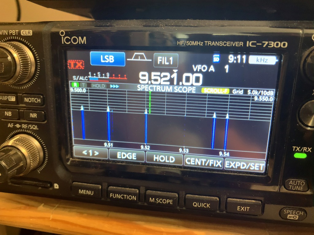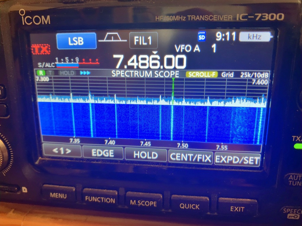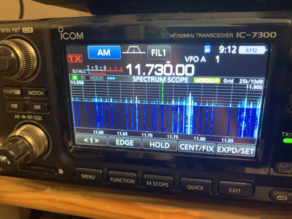短波放送(海外放送)帯である。やはり、ノイズ(縦の白い線)が等間隔に発生している。