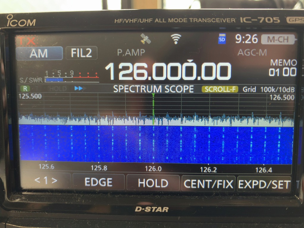 航空無線帯である。やはり、ノイズ(縦の白い線)が等間隔に発生している。