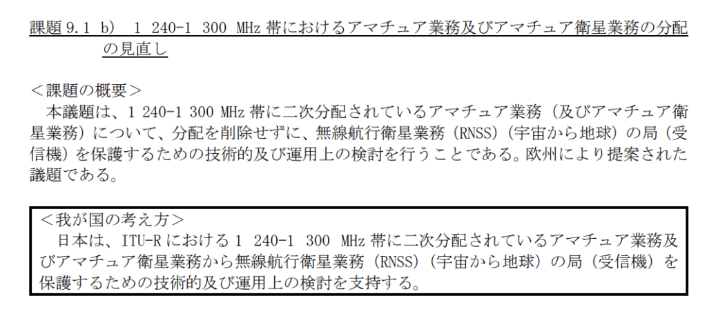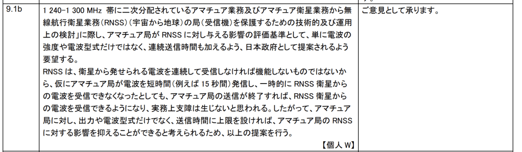 「1,240-1,300MHz帯に二次分配されているアマチュア業務及びアマチュア衛星業務から無線航行衛星業務(RNSS)(宇宙から地球)の局(受信機)を保護するための技術的及び運用上の検討」に際し、アマチュア局がRNSSに対し与える影響の評価基準として、単に電波の強度や電波型式だけではなく、連続送信時間も加えるよう、日本政府として提案されるよう要望する。