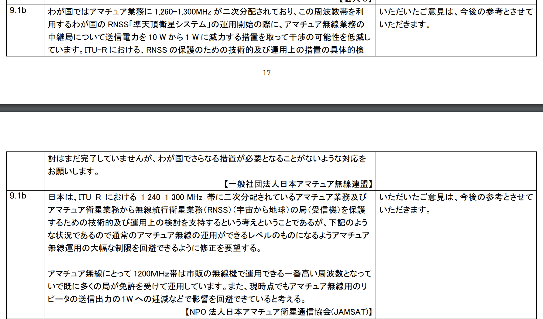 JARLが、レピータを1Wに減力したことに触れています。JAMSATは、1Wへの提言などで影響を回避できている、とより踏み込んだ意見を述べています。IARU等、さらに関係各所への働きかけが必要と考えます。