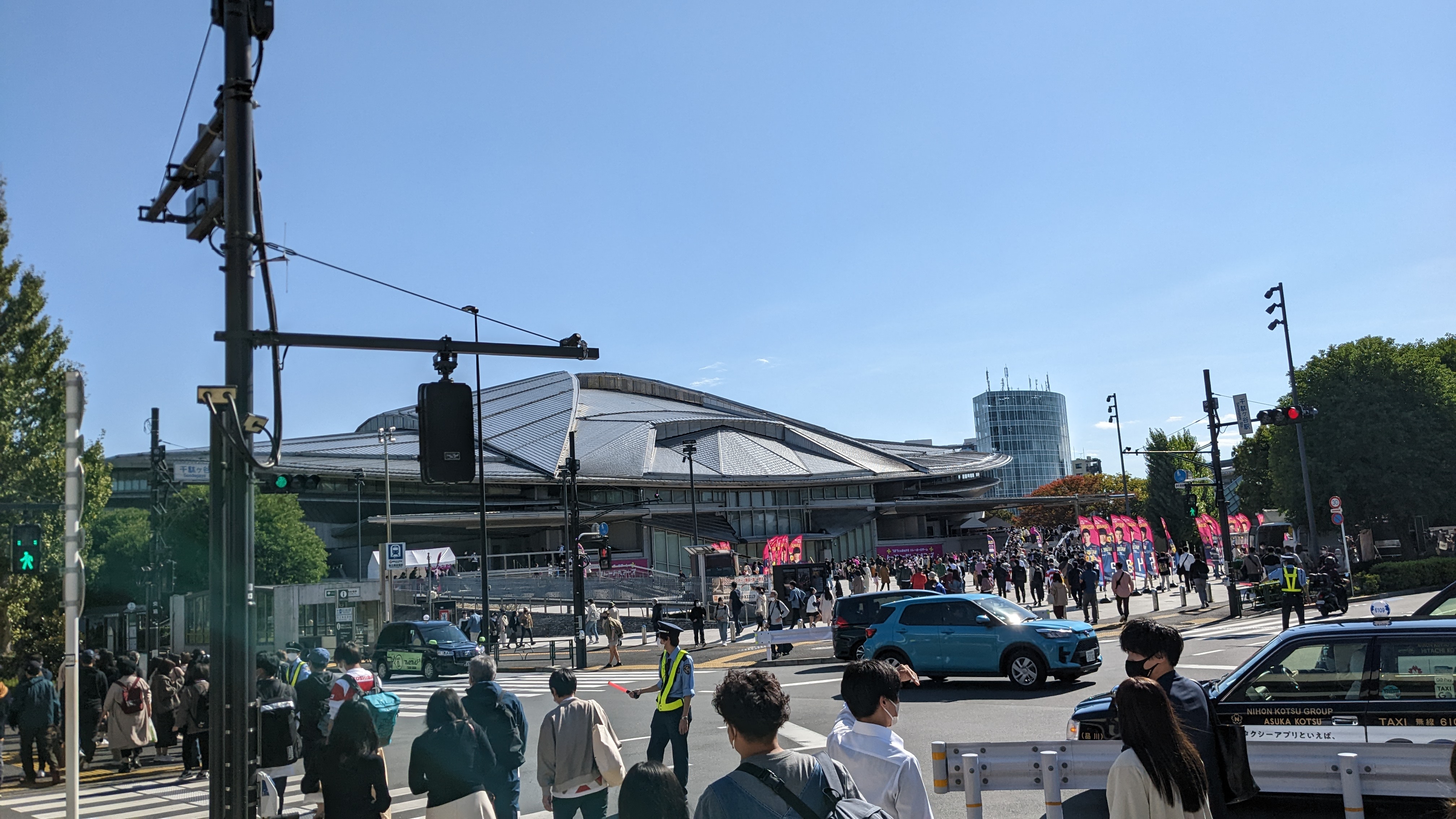うわー。ラグビー・日本対ニュージーランド戦の赤いノボリが並び、赤白のラガーシャツを着た方々がいっぱい。警察まで出ています。お昼ごはんを買おうにもコンビニに人があふれかえっていて入れません(汗)。