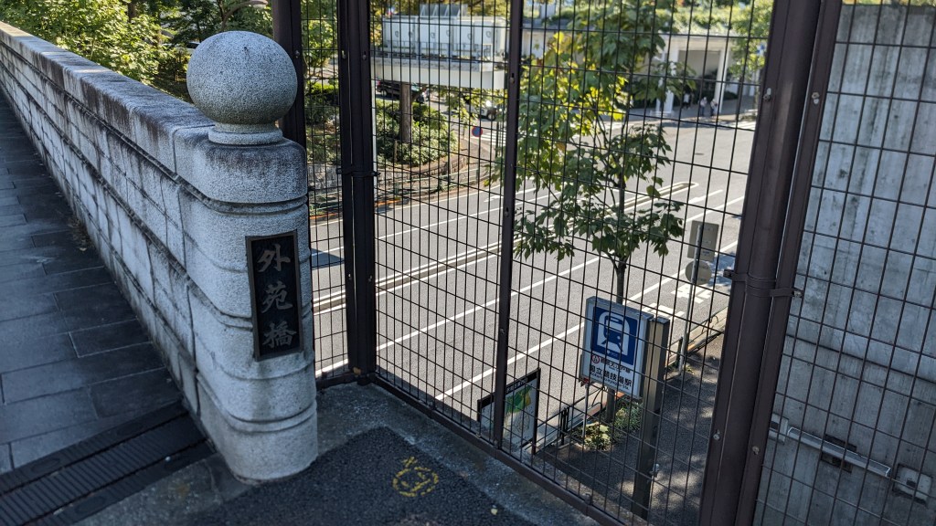 「外苑橋」(陸橋)から下を見ると、駅の入り口が見えます。駅前QRVと言えましょう。よしここに決めた、ということで、明治公園の東北の角あたりに陣取ります。