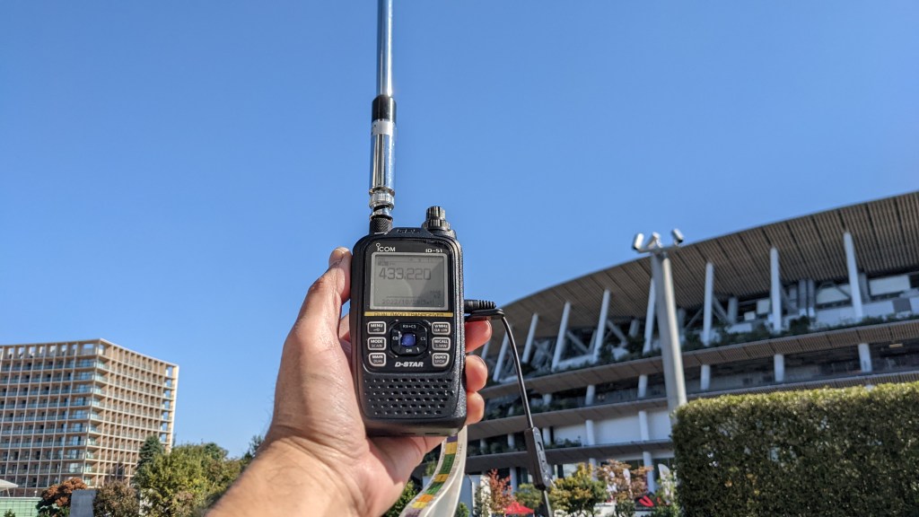 都心とは思えない緑。気持ちいい・・のですが、430MHzでCQを出すも空振り続き・・何とか2局コール頂くも弱く、仕事の時間までにPOTAノルマの10局を達成できるか不安になります。やむを得ない、駅からはちょっと離れますが、「駅前の施設内」ということで駅前QRVのお許し?を頂くこととして、もう少しロケのいいところを探します。