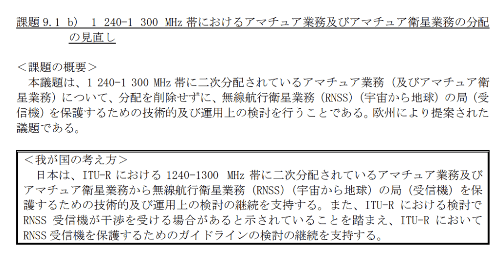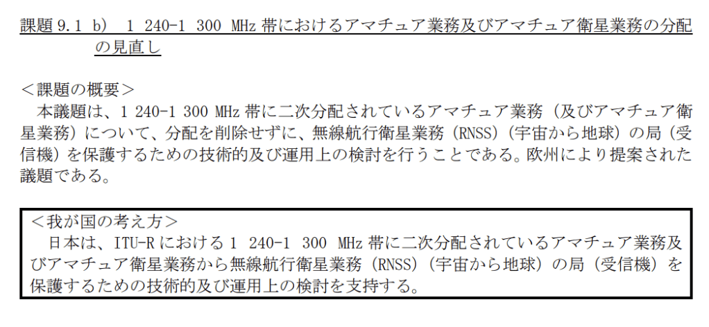 「1,240-1,300MHz帯に二次分配されているアマチュア業務及びアマチュア衛星業務から無線航行衛星業務(RNSS)(宇宙から地球)の局(受信機)を保護するための技術的及び運用上の検討」に際し、アマチュア局がRNSSに対し与える影響の評価基準として、単に電波の強度や電波型式だけではなく、連続送信時間も加えるよう、日本政府として提案されるよう要望する。