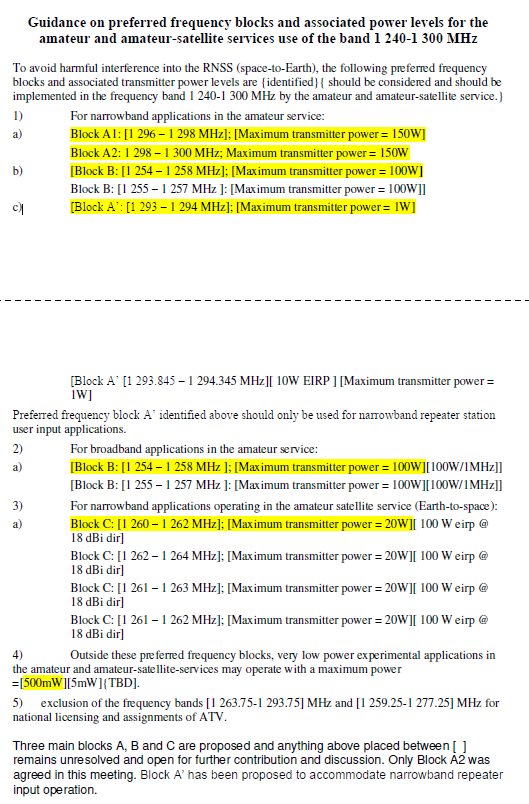 関係者の予備会合で、1298~1300MHz(Block A2)はアマチュア業務に確保されることが合意されたようです。上限150Wまでとされているのは、EMEを念頭に置いているのでしょうか。