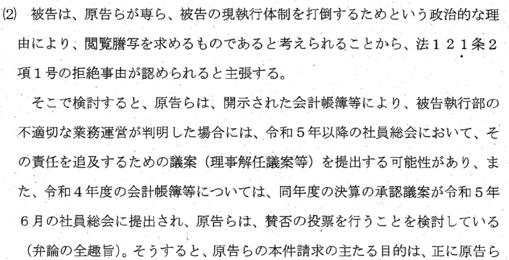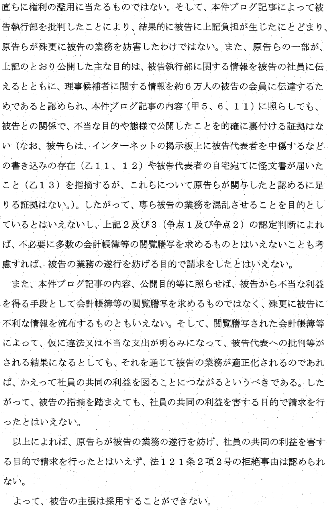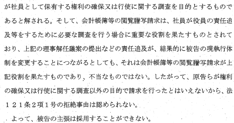 ですが、裁判所は、社員有志は、正に社員として保有する権利(社員総会での賛否の投票)に関する調査として開示請求をしていると認めました。そして、理事解任議案の提出など社員による責任追及が、結果的にJARLの現執行体制を変更することにつながるとしても、それは、会計帳簿の閲覧謄写請求がその重要な役割を果たしたことを意味し、不当なものではないとして、JARLの開示拒絶を認めませんでした(判決文14~15頁)。