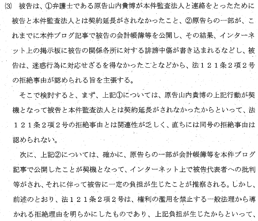 JARLは、弁護士である山内がJARLの監査法人と連絡をとったために契約延長がなされなかったから、開示を拒絶すると主張しました。ですが、裁判所は、関連性が乏しく開示を拒絶する理由にはならないと判断しました(判決文16頁)。