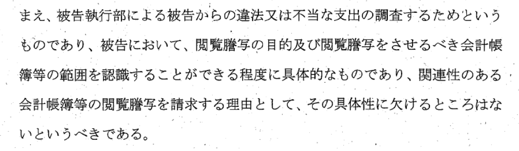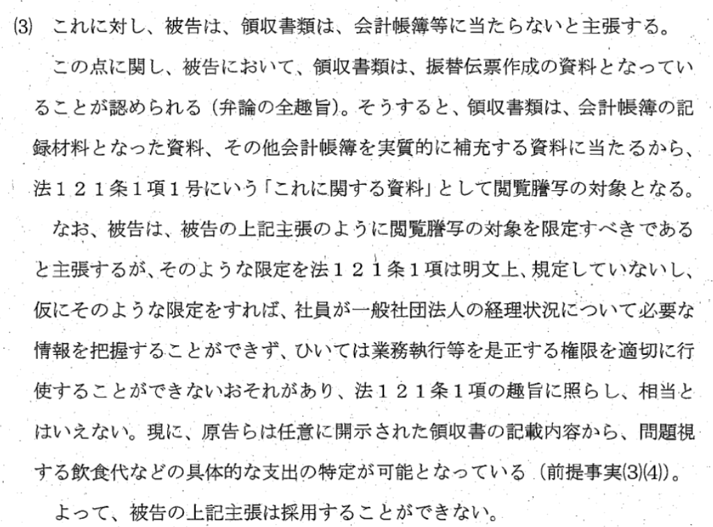 ですが、裁判所は、領収書の開示を認めなければ、社員がJARLの経理状況について必要な情報を把握することができず、業務執行の是正を適切に行えないおそれがある、現に、過去に開示された領収書の記載内容から、社員らが問題視する飲食代などの具体的な支出の特定が可能になったとして、領収書類も開示の対象と認めました。