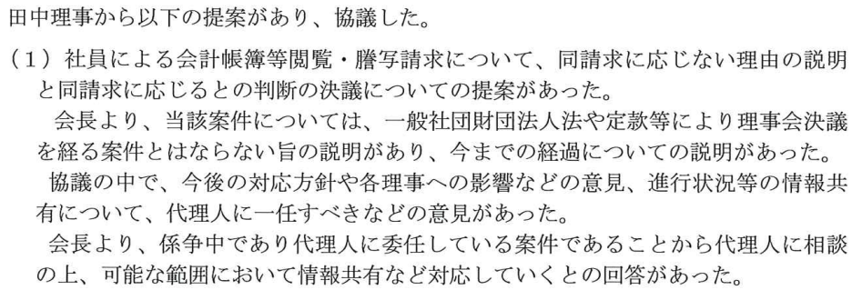 今回の開示請求訴訟について、JARL会長髙尾氏は、理事会に諮ることなく独断で訴訟対応を進めました。また、今年2月の理事会において、JR3QHQ田中理事が、会計帳簿の開示に応じることを決議する議案を提出したにもかかわらず、JARL会長髙尾氏は、これを無断で協議事項に格下げするなど、ガバナンスが効かない状況に陥っています。一般社団法人においては、全ての理事に議案提案権があり、理事の提案した議案を協議事項に格下げした髙尾氏の取扱は不適切でした。