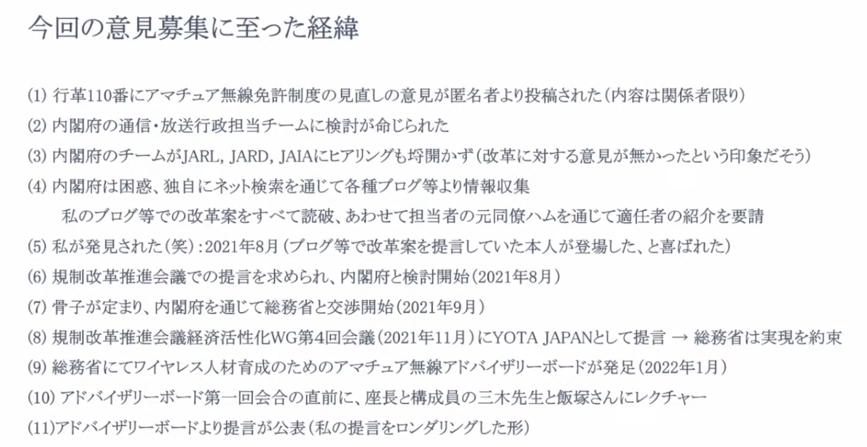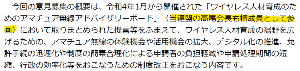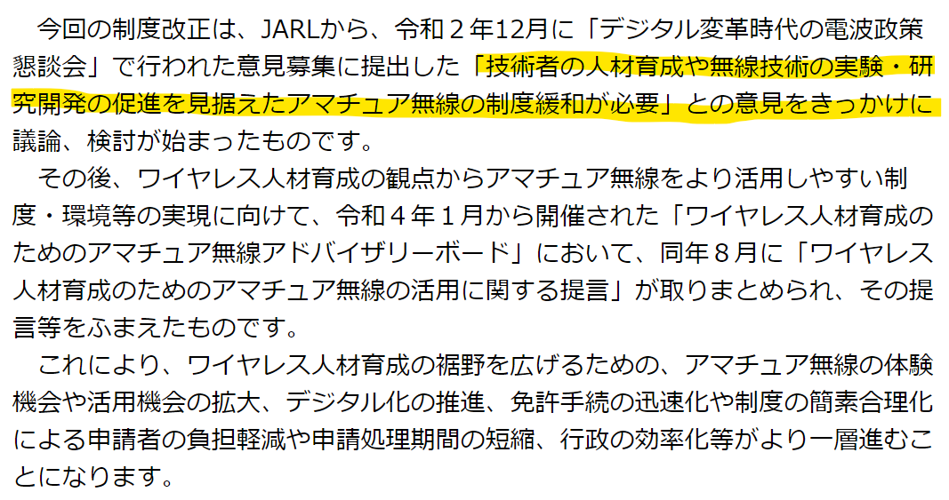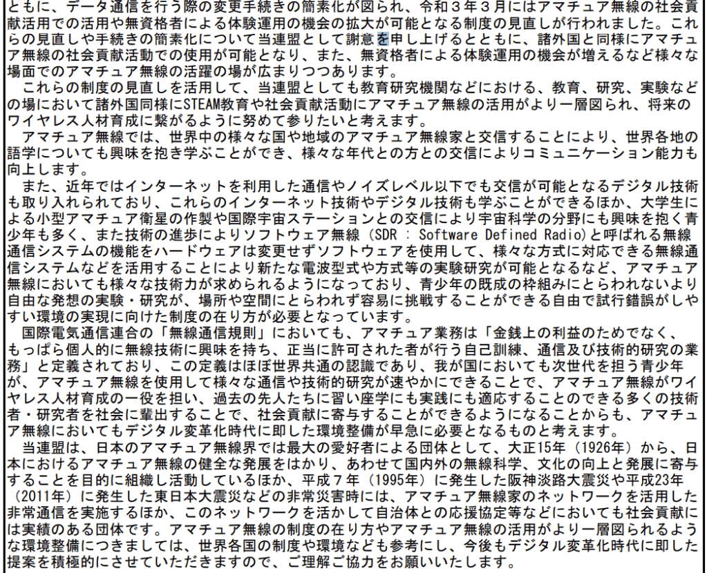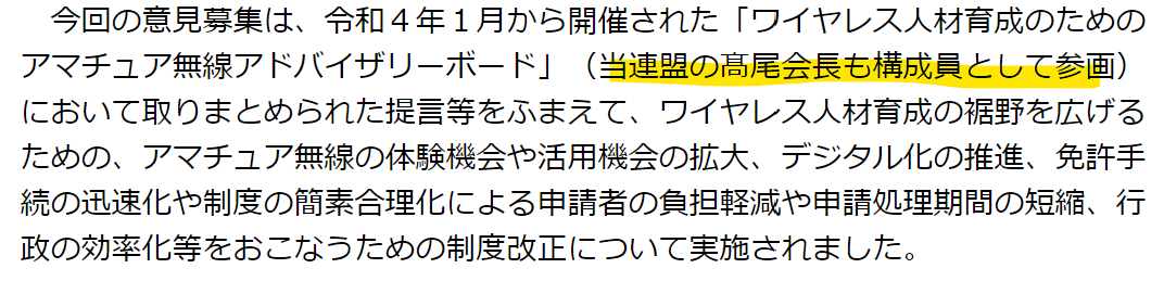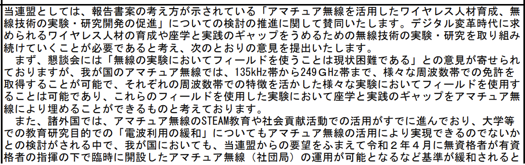他方、JARLの意見はこちら。文章はやたら長いのですが、法制度をどう変えてほしいのか、ほとんど読み取れません。