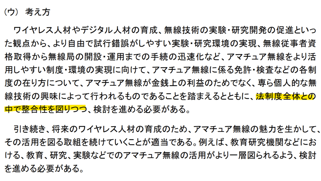 ご覧のように、「法制度全体との中で整合性を図りつつ」という、後ろ向きの言葉が入っていました。「そんなに変えないぞ」という総務省の意図が透けて見えました。私は、アマチュア無線に厳しい規制を課す必要はないと考えており、「他の無線局との差異を法制度全体の中に適切に位置づけつつ」と修正すべきである、との意見を出しました。