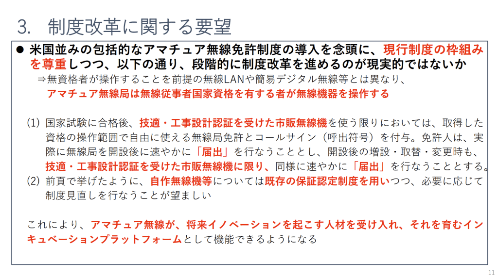 「無線従事者資格と無線局免許が一体となる」いわゆる「包括免許制度」を要望しています。長年の願望を繰り返しただけで、具体的な改正案を提案したわけではありません。