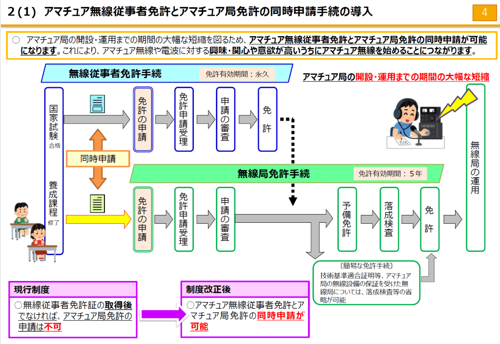 - 国家試験に合格後、従事者免許と無線局免許(コールサイン)を同時に付与すること