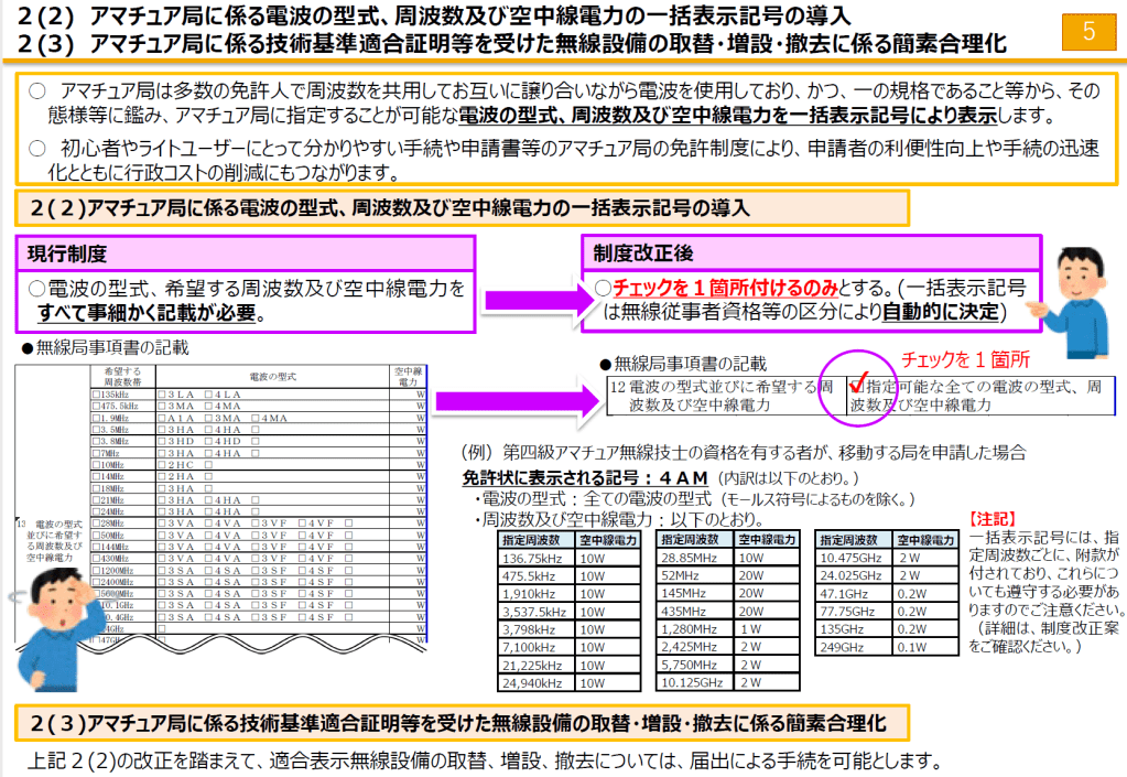 - 一括表示記号(電波型式・周波数及び空中線電力)の導入による局免記載事項の簡素化と、その結果、「届出」ですむケースの大幅拡大