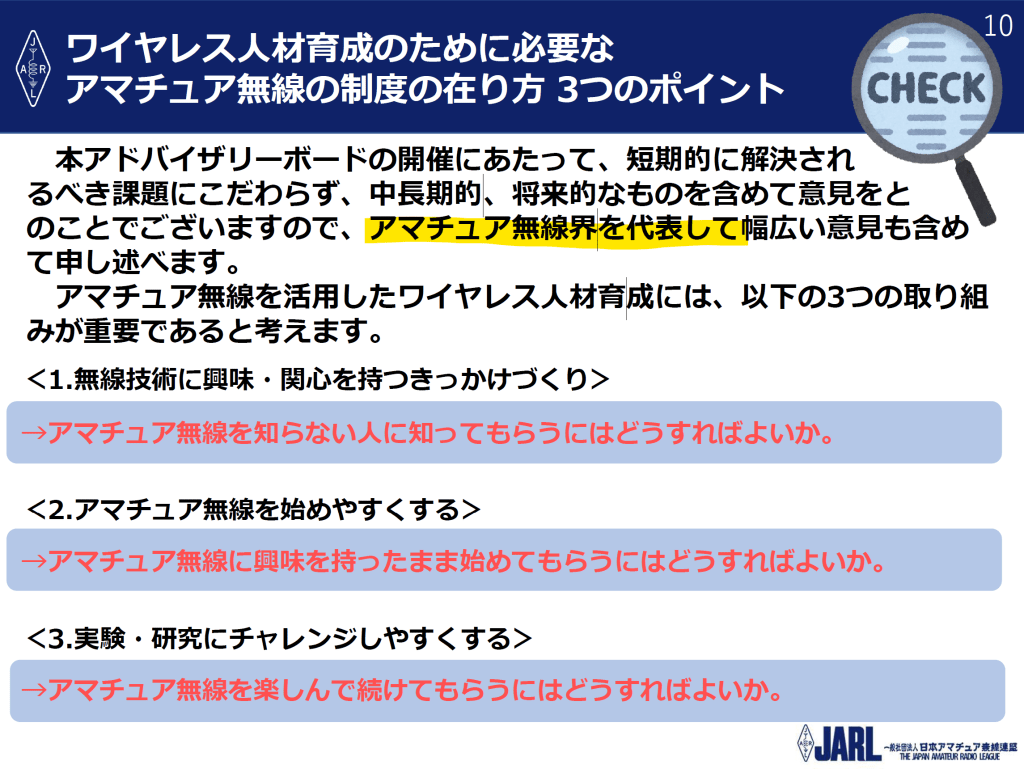 髙尾氏は、「アマチュア無線界を代表して」意見を述べると言っています。しかし、このプレゼンに先立ち、アマチュア無線界から意見を公募したわけでもなく、誰の意見をもとに作成したのかわかりません。