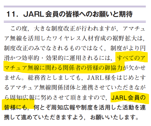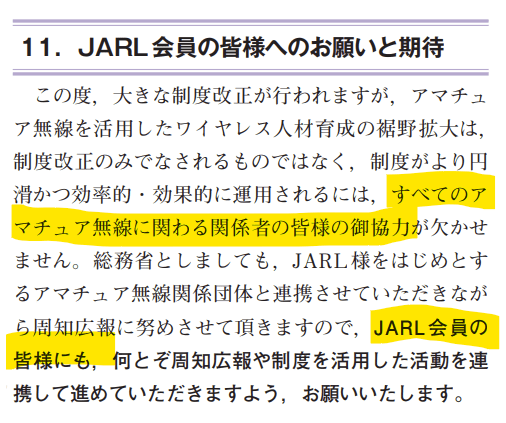 改正法令施行と同時に公開された総務省の解説に、わざわざ「JARL会員の皆様へのお願いと期待」なる項目が用意され、このように書かれています。