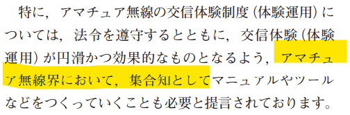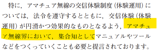 また、総務省は、「集合知として」、つまり、これまで体験局や体験運用を経験してきたアマチュア無線家の知識・経験を集めて、マニュアルやツールを作ることを期待しています。