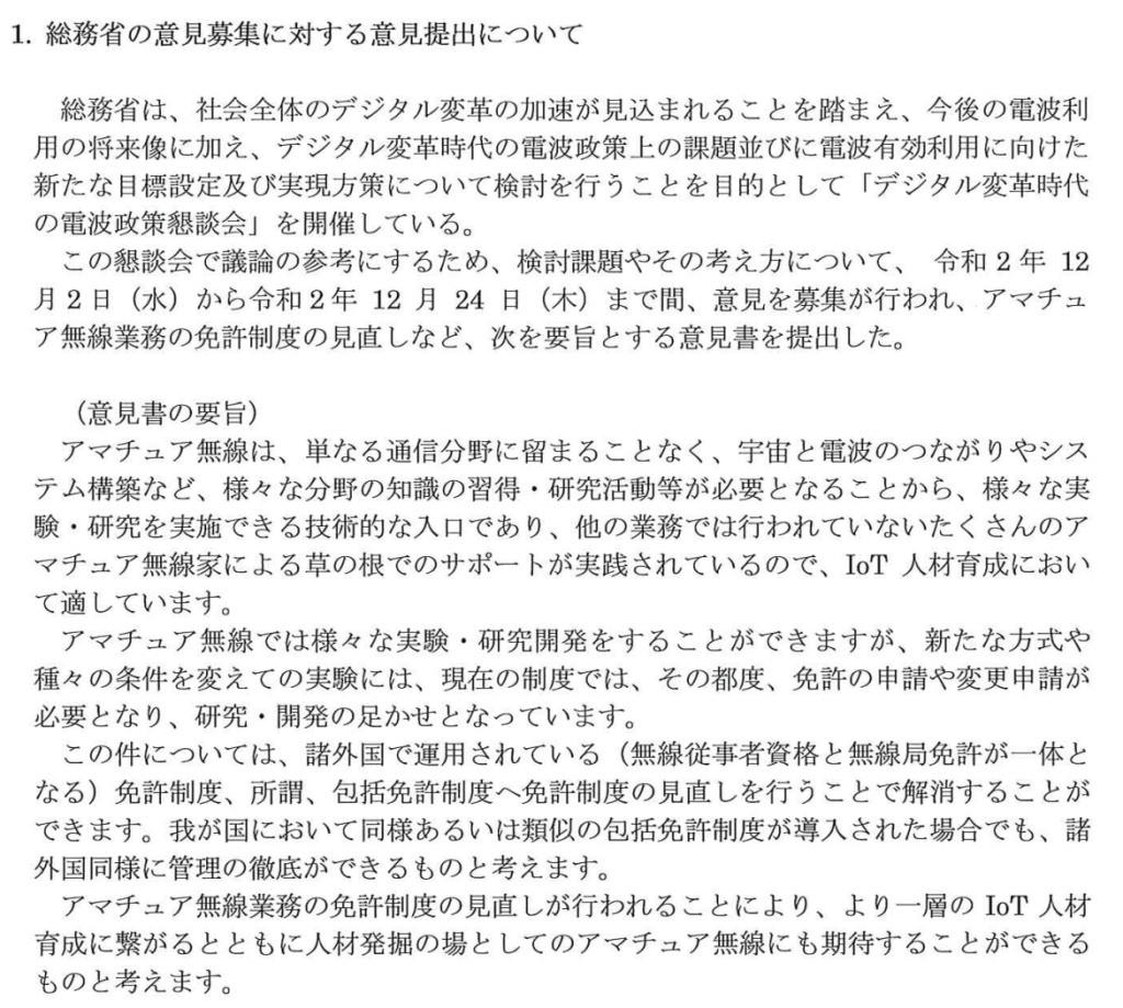 確かにJARLは、「デジタル変革時代の電波政策懇談会」が始まってすぐの2020年12月に意見を出していました。その要旨が、JARL第54回理事会報告に掲載されています。