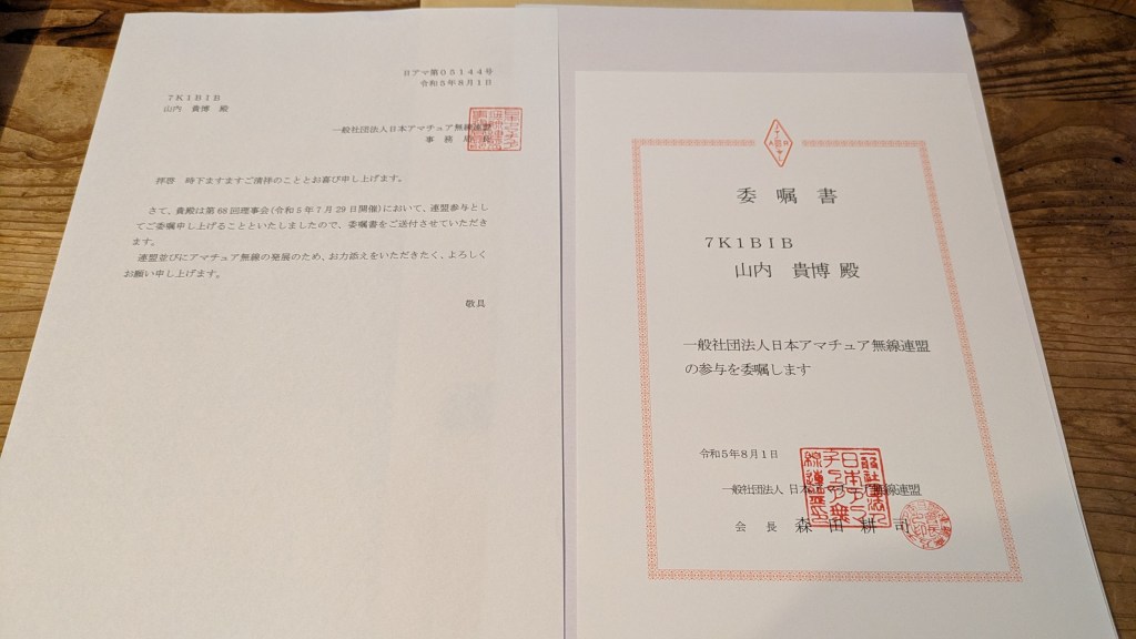 2023年7月29日(土)に開催されたJARLの第68回理事会(臨時)において、「参与」に任命されました。謹んでお受け致しました。改めて、無線趣味の世界が少しでもよくなるよう微力を尽くす決意を新たにしております。