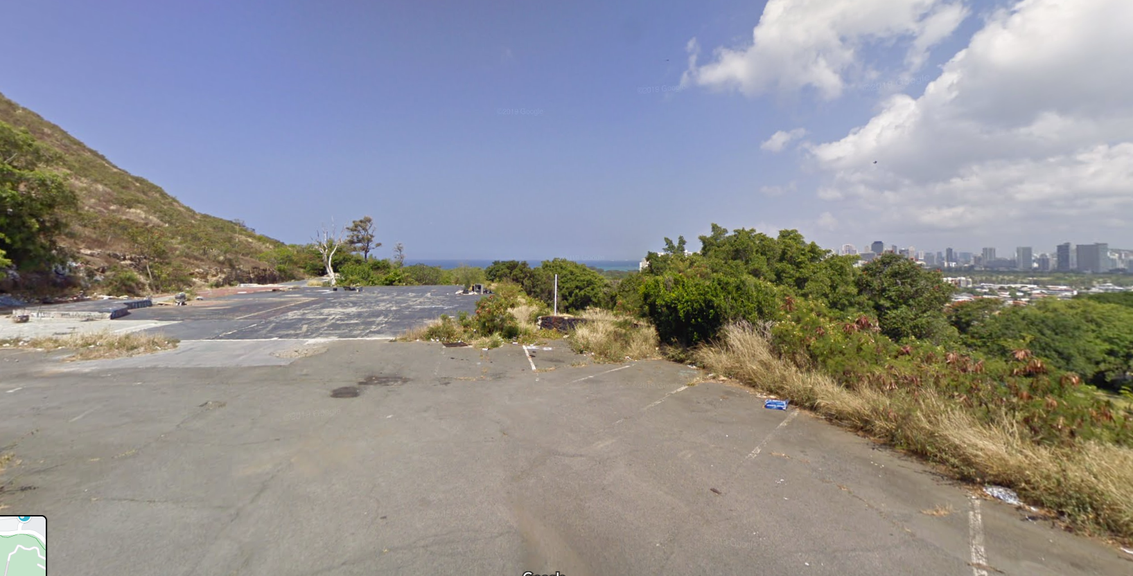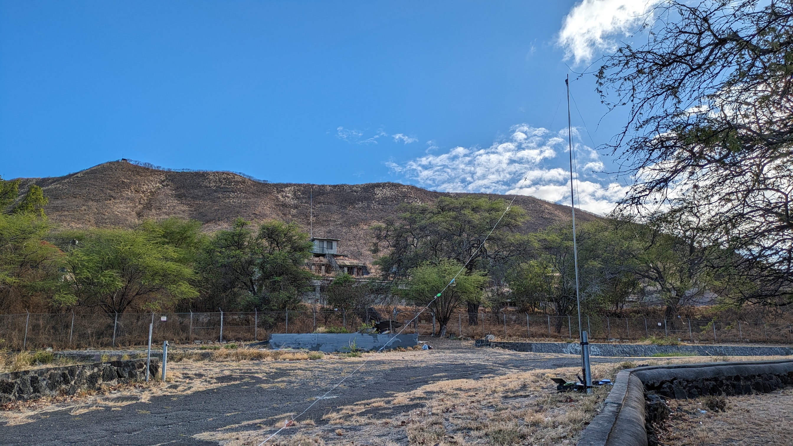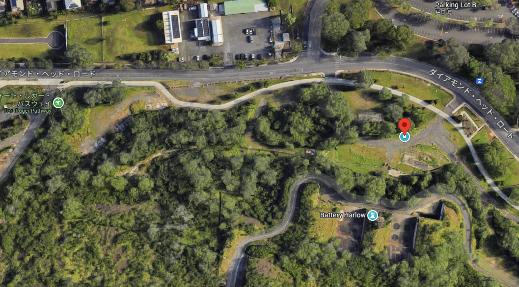 滝を散策した日、9月11日の午後、ようやく無線運用の時間を確保できました。ホテルから車で15分ほどのDiamond Head State Preserve (K-6425) に行くことにします。もっとも、観光のメインルートでやるわけにはいきません。地図をにらむと、北の裾野、Diamond Head Roadから分かれる道の突き当たりに、アンテナを展開できそうな広場を見つけました。ちゃんと公園のエリア内。右の空中写真にピンを立てたあたりです。