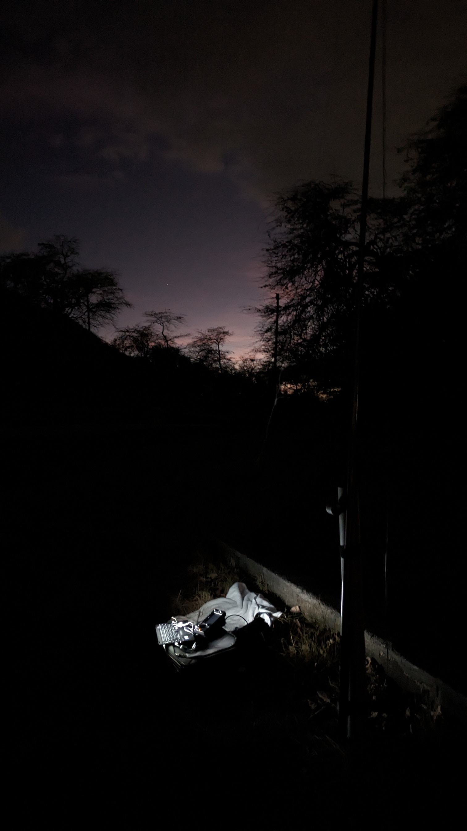 上の写真のピンを立てたあたりにおあつらえ向きの棒が立っていました。少し離れたところに路上生活者のテントが見え、ちょっと不安を感じますがここでやることに決めます。